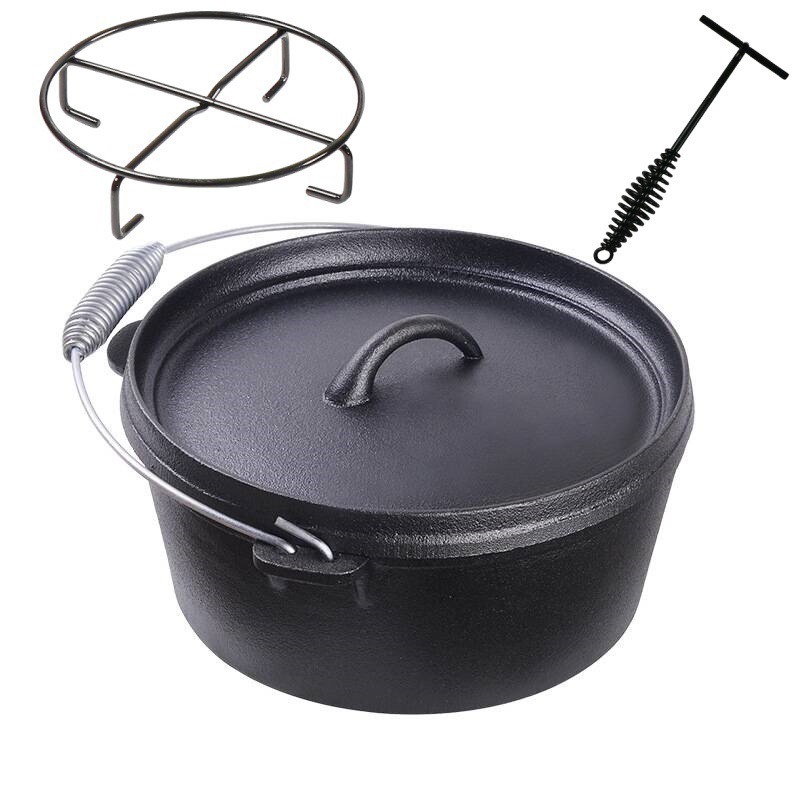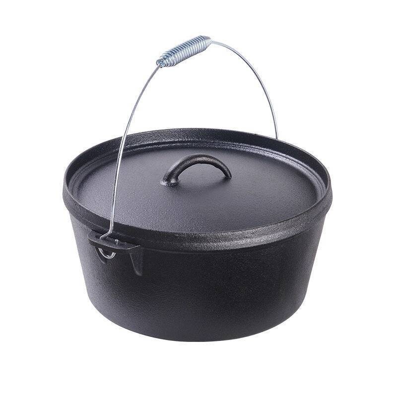 Made from high-purity molten iron using sand-casting technology, this Dutch oven offers exceptional durability and thermal balance. It evenly distributes heat across all surfaces, making it ideal for long stewing and roasting outdoors.